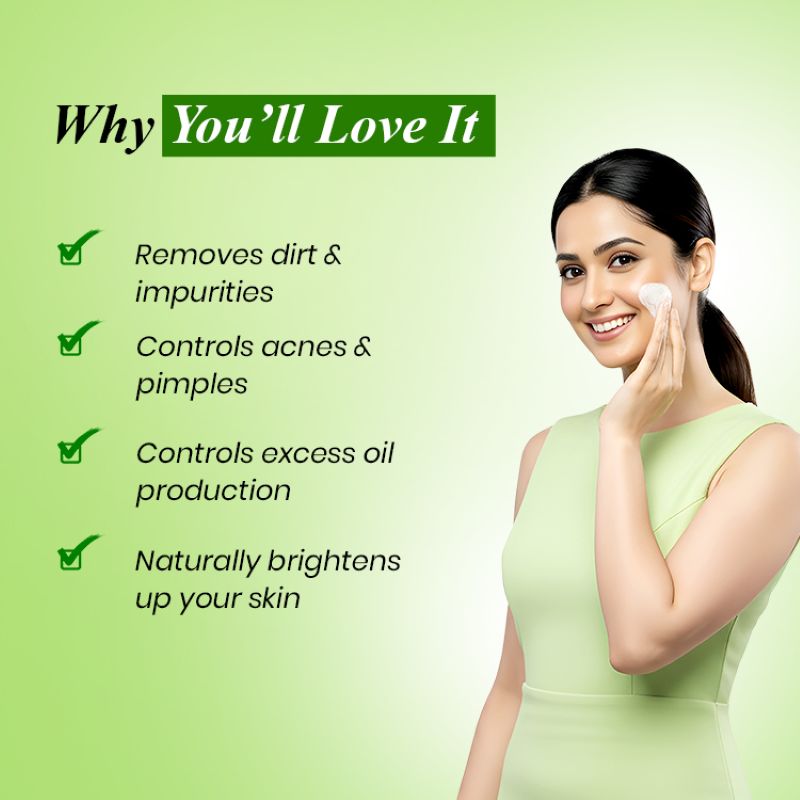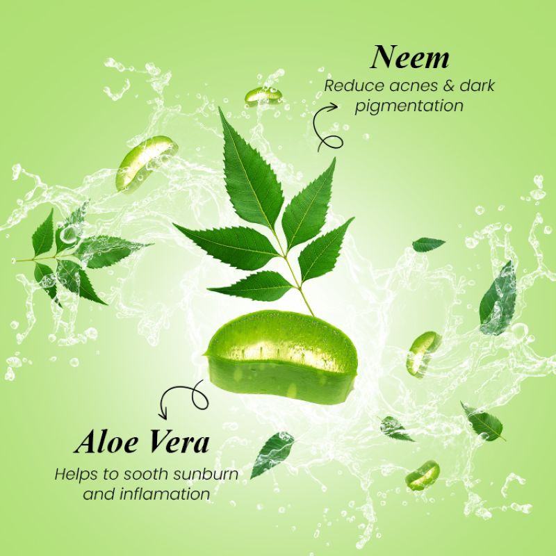 Neem has antibacterial and antifungal properties, which can help in preventing and treating acne and Aloe Vera has a soothing and cooling effect on the skin, making it ideal for calming irritated or sunburned skin.